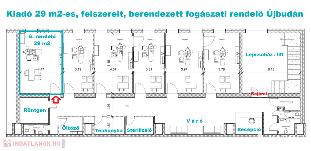 A komplexumban egymás mellett 6 rendelő kiadó, ez a rendelő 29 m2 alapterületű, teljesen felszerelt, Optimal 09 kezelőegységgel, fogászati eszközökkel és rendelői bútorzattal ellátott.