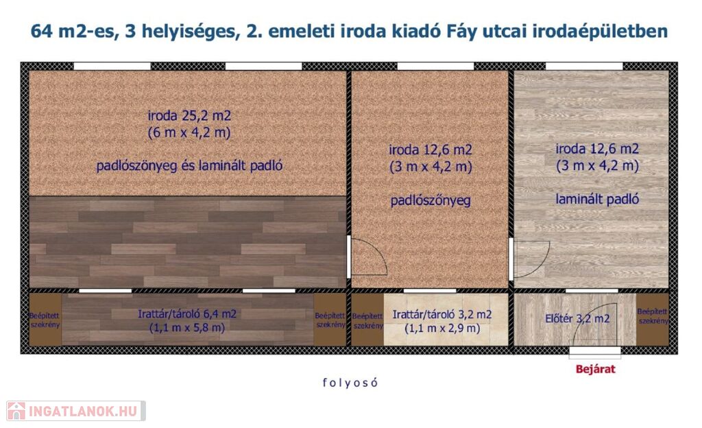 A három egymásból nyíló helyiségből álló iroda az irodaház 2. emeletén helyezkedik el. A helyiségek laminált padlóval, illetve szőnyegpadlóval burkoltak.