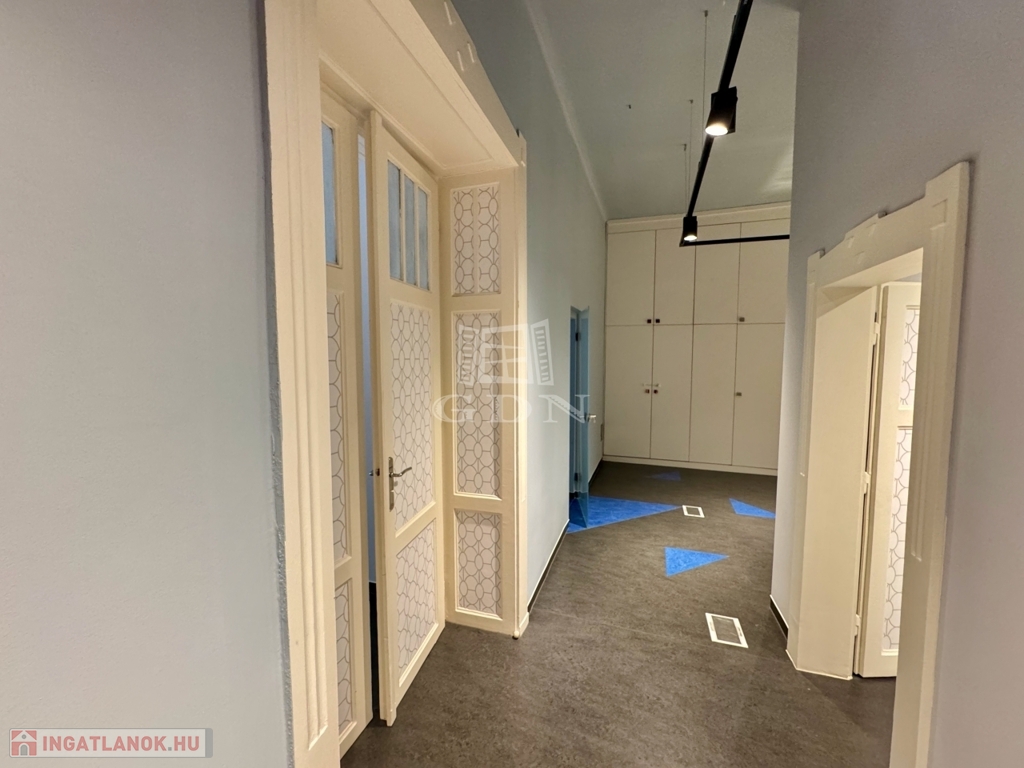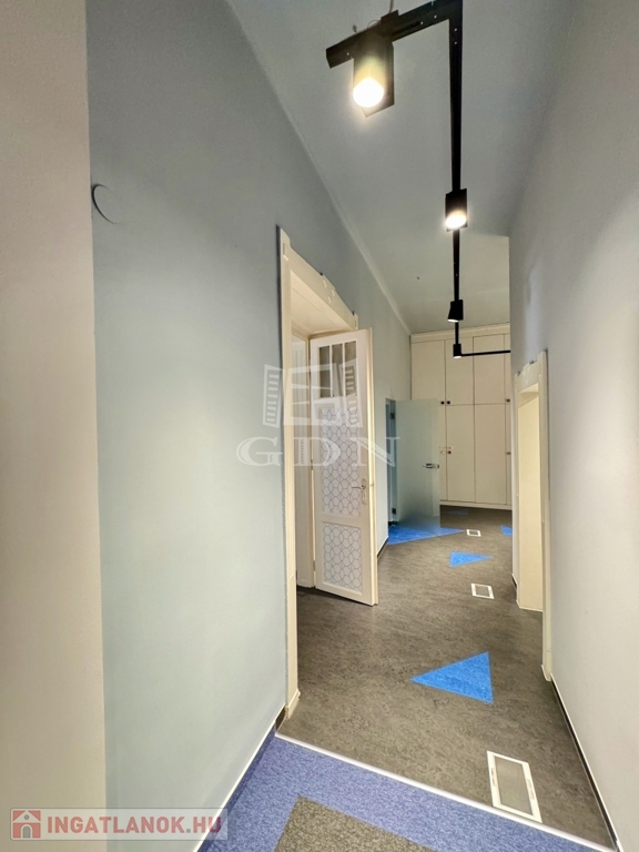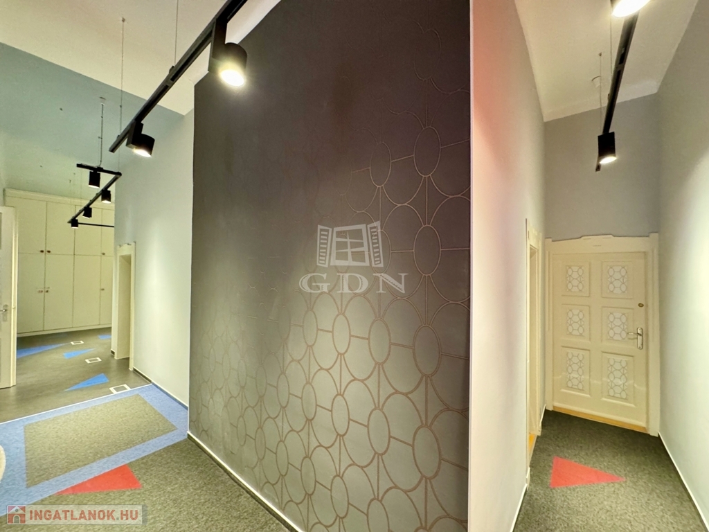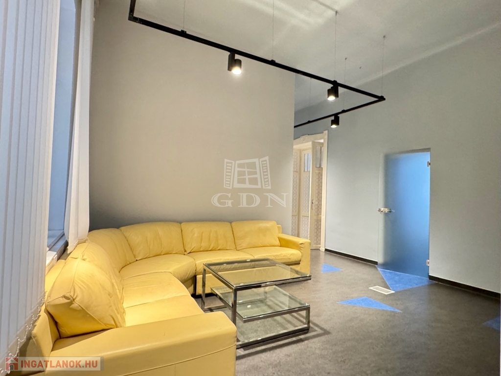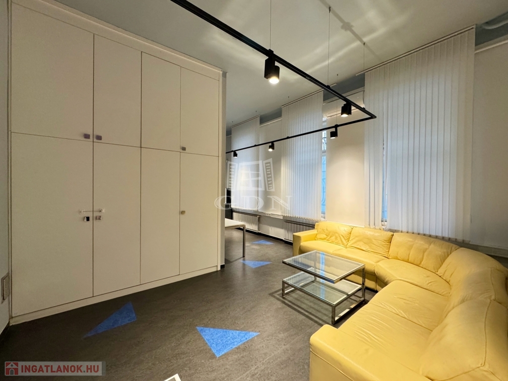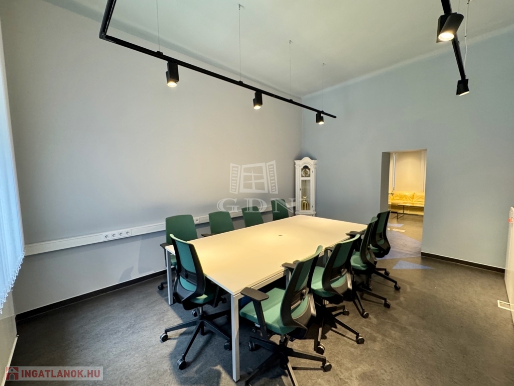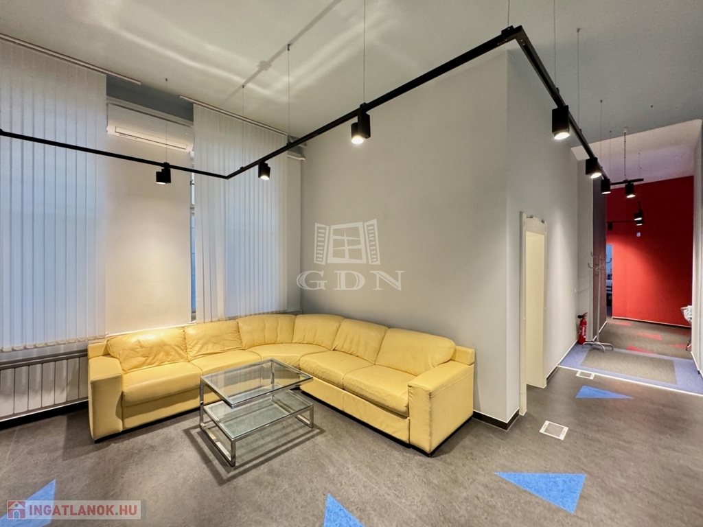 Az emeleti szint jelenleg megosztott kettő irodával, melyből a 100m2-es rész képezi a bérlemény tárgyát.