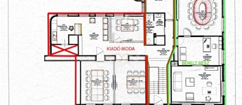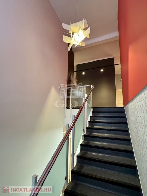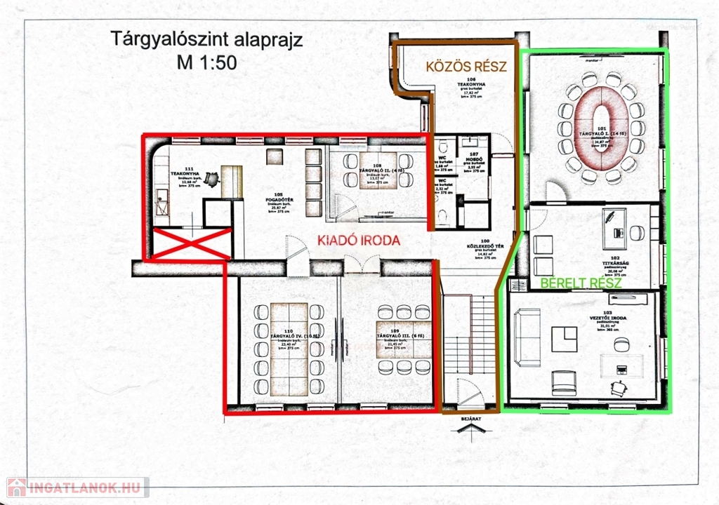 Helyiségei: lépcsőház, közlekedő, teakonyha, recepció/fogadó tér melyből 3 külön bejáratú irodahelyiség nyílik.