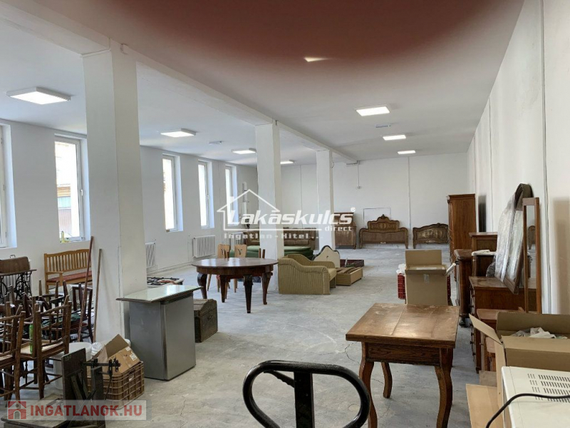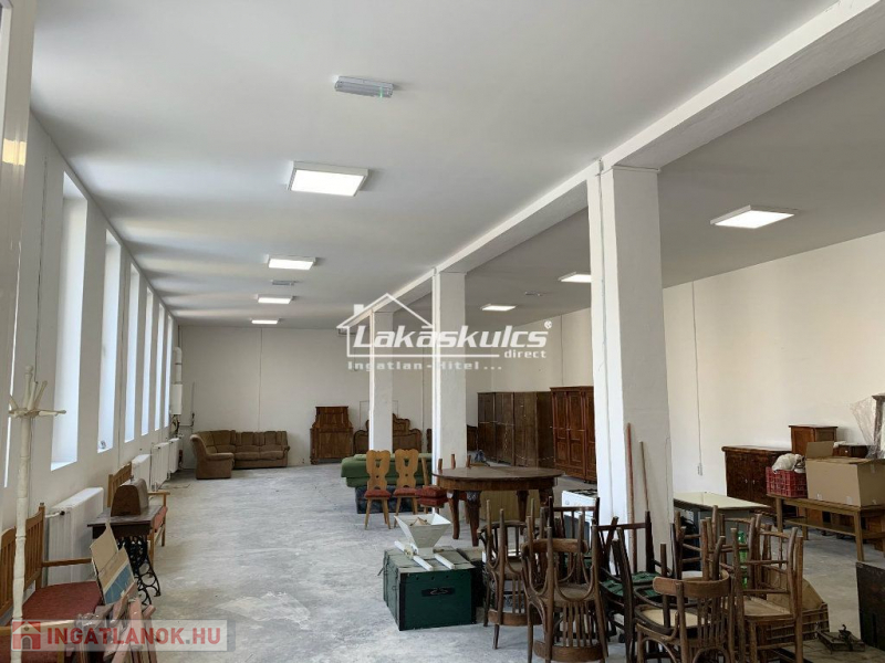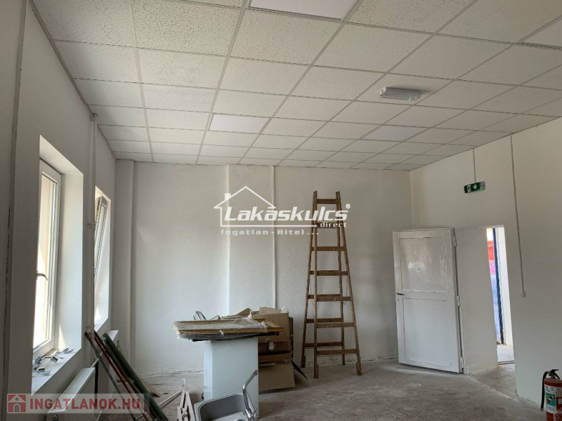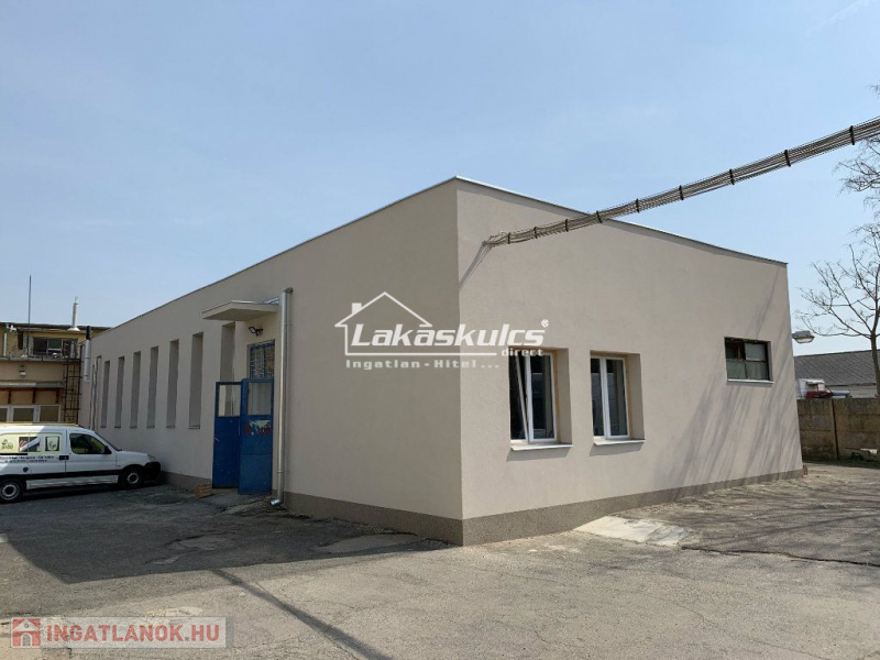Helyiségek: 160 m2-es csarnok, 10 m2-es vizesblokk-szociális helyiség, 28 m2-es iroda.