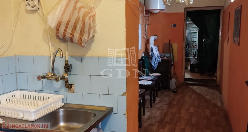 A pult mögötti részről jutunk a személyzeti részhez, ahol konyha, tároló, valamint személyzeti mosdó van.