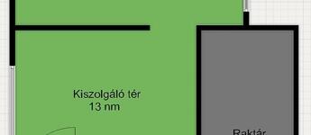 Rendelkezésre áll egy 22 nm-es üzletrész, mely kiszolgálótérből, konyhából és mellékhelyiségbő áll, valamint egy kb. 12 nm-es, különnyíló üzletrész, ahol a víz és villanyhálózat szintén be van vezetve. Ez a helyiség akár külön is kiadható.