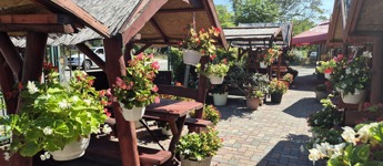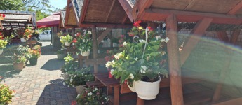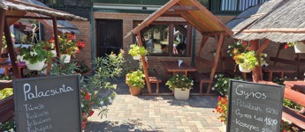 A teraszon 60-70 fő fér el a szép vörösre festett gerendából készült, fedett asztalos , sok virággal díszített kerti kiülőkön.