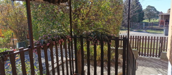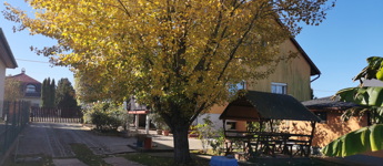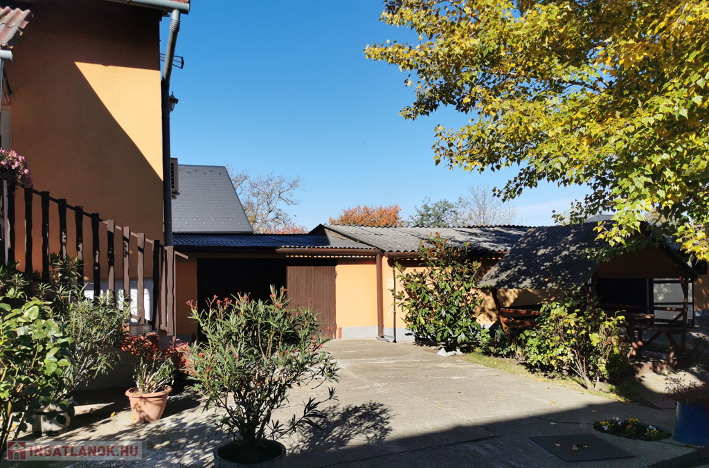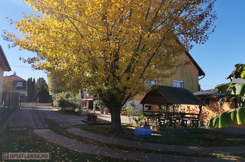 Udvar: előkertben rózsabokrok, 6 személyes kisméretű pavilon, 2 db nagyméretű tuja, 3 db banánfa,