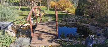gyümölcs cserjék, kb 8 m3-es halastó híddal, gyümölcs bokrok,
