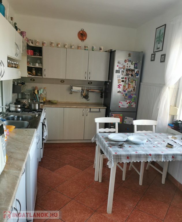 A földszint 57 m2 - 2 db 17,6 m2 szoba (mindkettő laminált padlós), konyha 9,8 m2,