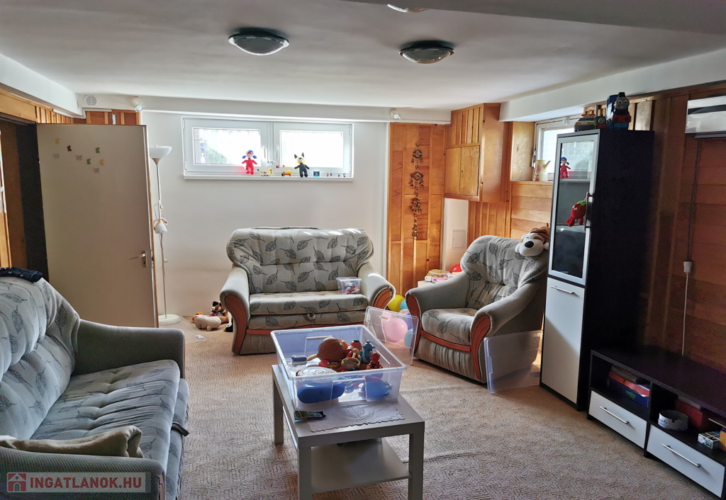 Szuterén 53 m2 - 4 db helység: 1. 34m2 padlószőnyeg borítás 2. 8,4 m2 - tároló- 3. 12 m2 (járólap borítás sarokban bárpult),