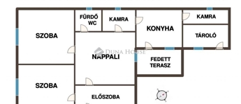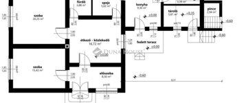 Helyiségeket tekintve kialakításra került 2 darab hálószoba, nappali, konyha étkezővel és kettő darab kamrával, fürdő WC-vel és egy előszoba.A főépületen kívül létesült továbbá egy 6 m2-es fedett terasz, 10 m2-es pince, 16 m2-es garázs és egy 20 m2-es tároló.