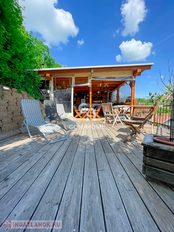 A telek felső szintjén kialakításra került egy térkövezett napozó terasz, egy kb. 30 m2 vörösfenyő terasszal. Itt helyezkedik el a fedett grillterasz, ami kb.50 m2 és külön WC-vel, mosogatóval, konyhapulttal és kemencével rendelkezik.