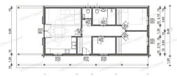 Jó a ház elosztása is, tágasak a terek. Konyha-nappali-étkezőt, 3 hálószobát, 2 WC-t és egy fürdőszobát látunk épített zuhannyal.