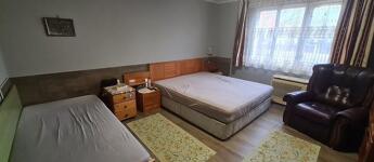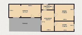 2 szoba, étkezős konyha, kádas fürdőszoba + mellékhelyiség, közlekedő, terasz.