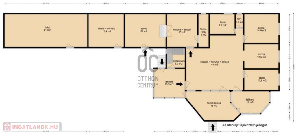 A házhoz épített jelenleg üzletként működő 41 m2-es épületrész számos egyéb funkcióra is alkalmas lehet.