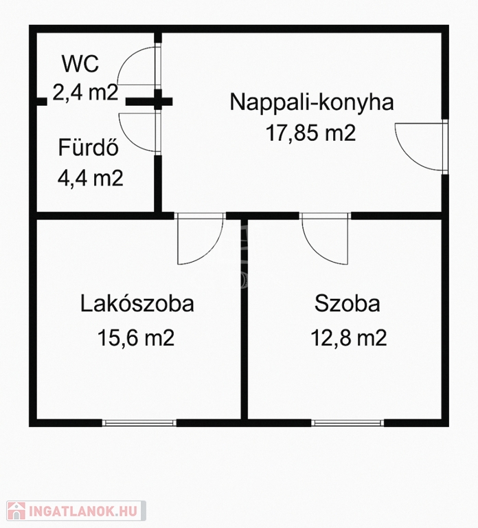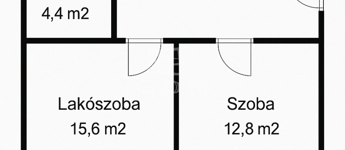 Modern elosztás: nappali–konyha (17,8 m²) + 2 külön nyíló hálószoba (15,6 m² és 12,8 m²)