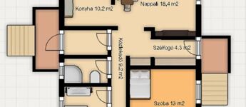 Az ingatlan amerikai konyhás nappalival, három külön nyíló szobával és két fürdőszobával rendelkezik. Az alaprajz jól átgondolt, praktikus és élhető, így a mindennapi használat során kényelmes teret biztosít a család minden tagjának.