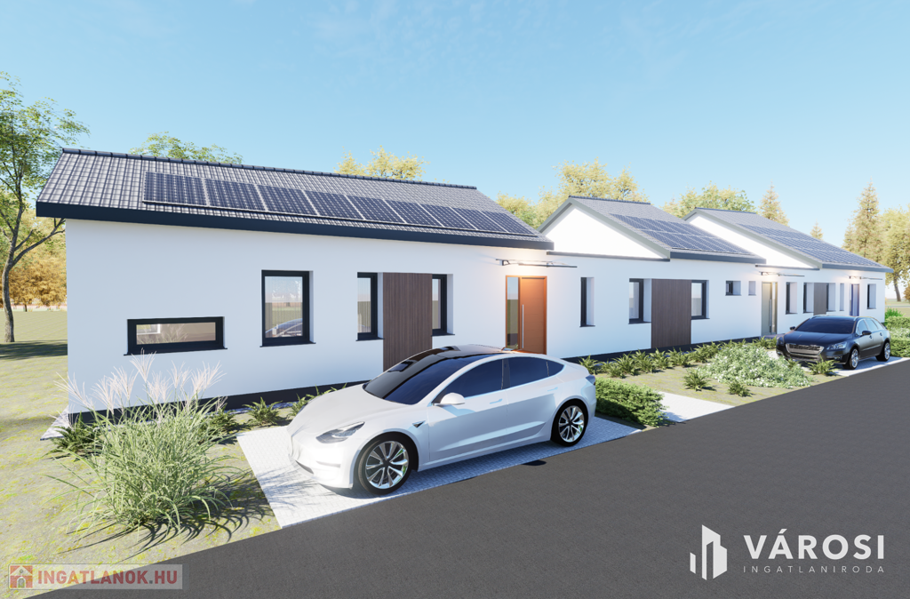 Eladó Hódmezővásárhelyen, Új-kishomokon a Mező utcában, új építésű 3 lakásos sorházban, 79,42 m2 hasznos alapterületű tégla ház. Az amerikai konyhás, nappali + 2 hálószobás ház remek tájolású, kényelmes életteret biztosít 3-4 fős család számára. Az ingatlanhoz ~ 420 m2 önálló kertrész tartozik, valamint társasház részére tervezett közös (6,00m x 3,00m) medence és napozótér.