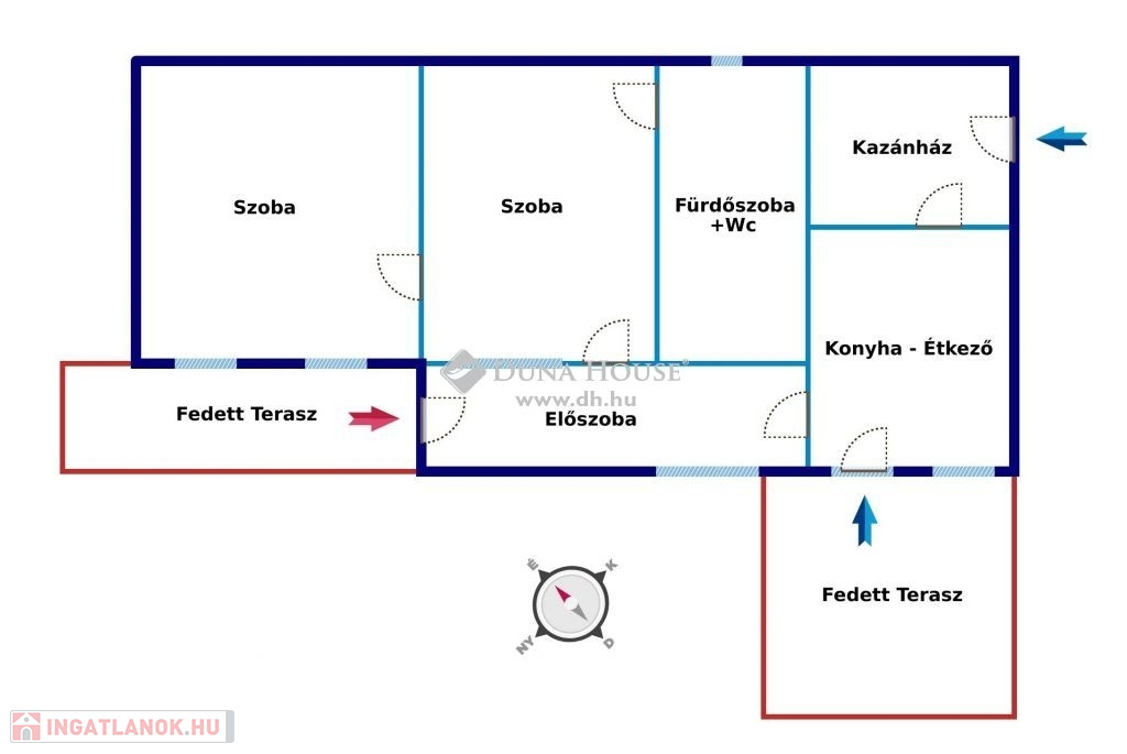 Az ingatlanban két tágas szoba, egy étkezős konyha, egy méretes fürdőszoba+wc, és egy előszoba helyiségek találhatóak. A lakótérhez kívülről és a ház felől is megközelíthető kazánház csatlakozik. Mivel minden helyiség ablakos, így fényviszony és szellőztethetőség tekintetében is előnyös tulajdonságokkal rendelkezik. Az előszoba és a konyha irányából, egy-egy jól használható, napfényes fedett terasz nyílik, mely a szabadban való pihenéshez, családi, baráti összejövetelekhez ideális helyet kínál.
