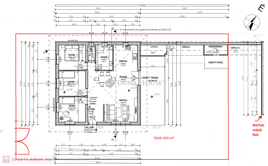 A hasznos alapterületen kívül egy 24 m2-es fedett terasz, 6 m2-es kamra és egy 4,5 m2-es tároló is kialakításra került.