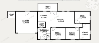 - Lakótér 96 m2, dupla garázs 32 m2, terasz 14 m2, tároló 3,3 m2, 480 m2 telek (lásd alaprajzon)