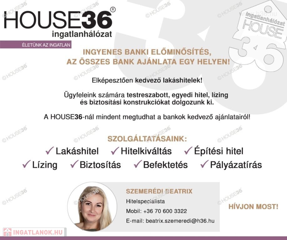 Forduljon hozzám bizalommal amennyiben felkeltette érdeklődését ez a remek lehetőség, ha eladó ingatlana van, illetve ha hitelre van szüksége! Szolgáltatásaink kereső ügyfeleink részére ingyenesek! Figyelem az adatlap megbízónktól kapott adatok alapján készült, pontosságáért felelősséget nem tudunk vállalni!