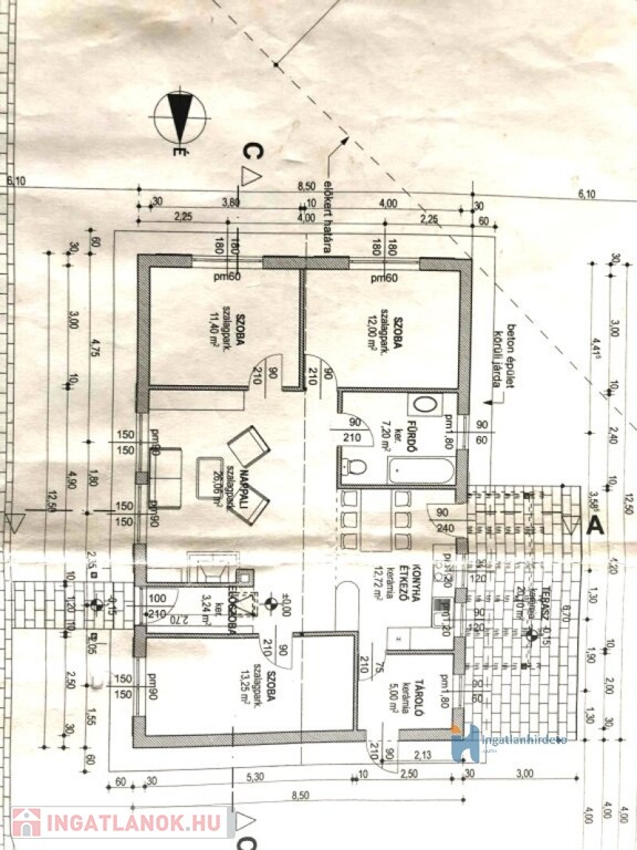 A házban található 3 szoba 13 m2, 12 m2, 11 m2, nappali-konyha-étkező 39 m2,