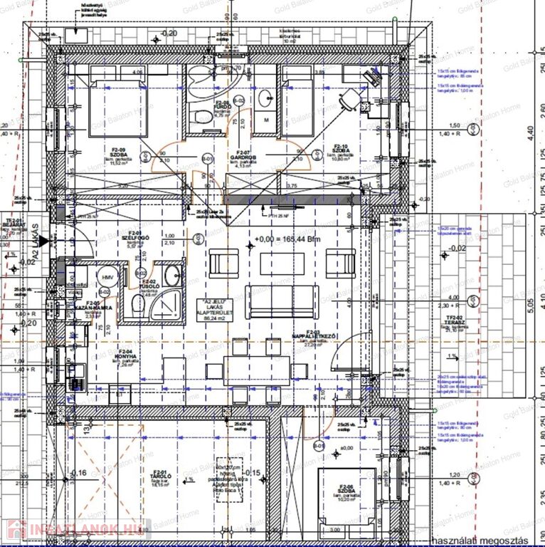 - földszintes teraszos házrész helyiségei: szélfogó, zuhanyzó +WC, nappali – étkező, konyha, kazán-kamra, gardrób, fürdőszoba káddal, mosdóval, WC-vel, 3 szoba, garázs, terasz