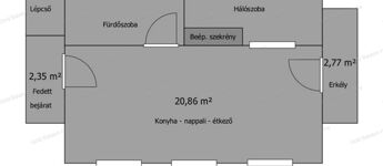 - emelet – kívülről – külön bejáraton át közelíthető meg: amerikai konyhás nappali, erkély (a befejezése az új tulajdonosra vár), hálószoba, fürdőszoba, WC
