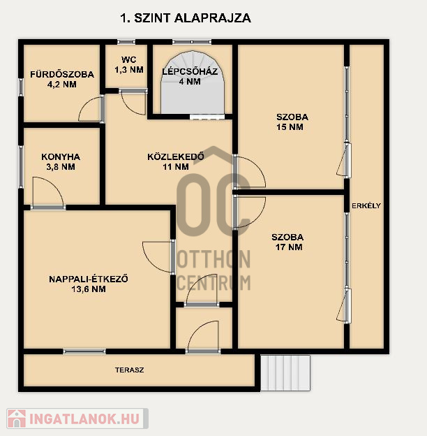 - 1. szint: 2 szoba, nappali-étkező, konyha, közlekedő, fürdőszoba, WC, lépcsőház, erkély összesen 70 nm hasznos alapterületű