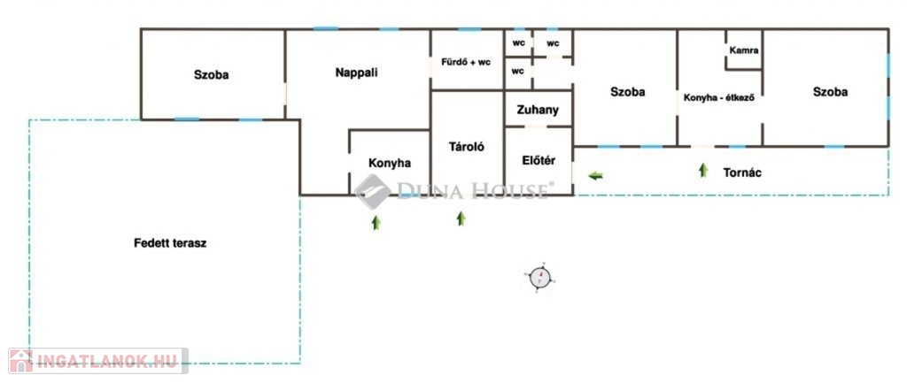 A két különálló bejárattal rendelkező lakrészekben összesen öt szoba található, így akár nagycsaládosok számára, akár kétgenerációs otthonnak is ideális választás lehet.