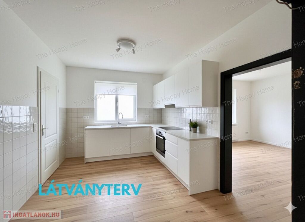 Helyiségek: szélfogó, előtér, 2 nagyméretű, külön nyíló szoba, konyha, közlekedő, fürdőszoba, külön WC, kamra