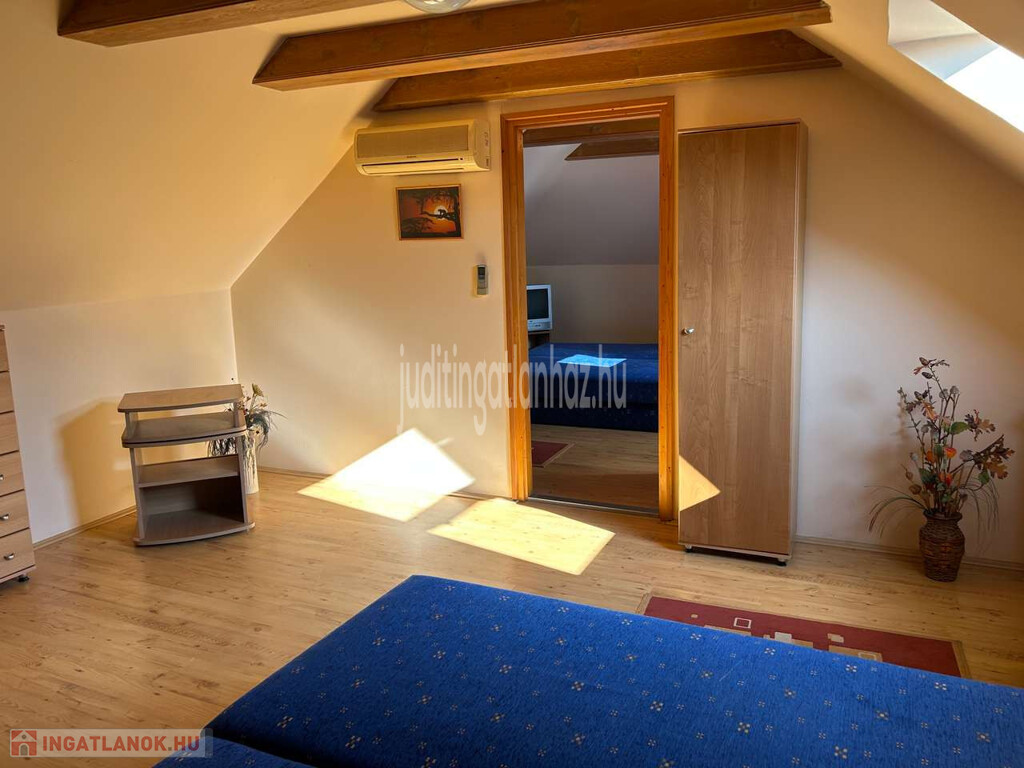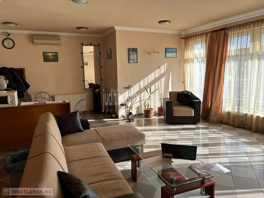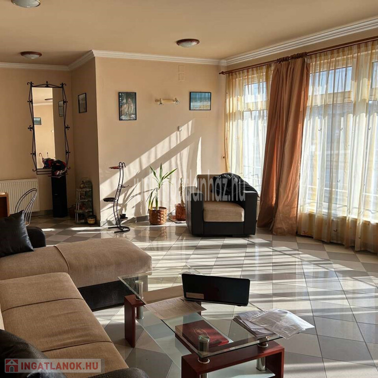 Nyíregyháza, Sóstóhegyen eladó 170 m2-s, öt szobás, kettő nappalis, négy fürdőszobás, két külön wc, kamra, műanyag nyílászárós, egyedi gáz és vegyes fűtésű, riasztóval felszerelt, 5 hűtő klímás, 30-s porotherm téglából épült, külsőleg 5 cm szigetelés borított, beton födémes rajta 40 cm salakgyapot szigetelés, dupla fedésű bramac betoncseréppel fedett jó állapotú szintes családi ház a hozzá tartozó 30 m2-s fedett, burkolt terasszal. Az ingatlan alatt teljes pince található mely burkolt és több fajta vállalkozásra alkalmas az 1250 m2-s zárt telken kiépített öntözőrendszer, fúrott kút, térkövezett nagy parkoló és két állásos garázs található.