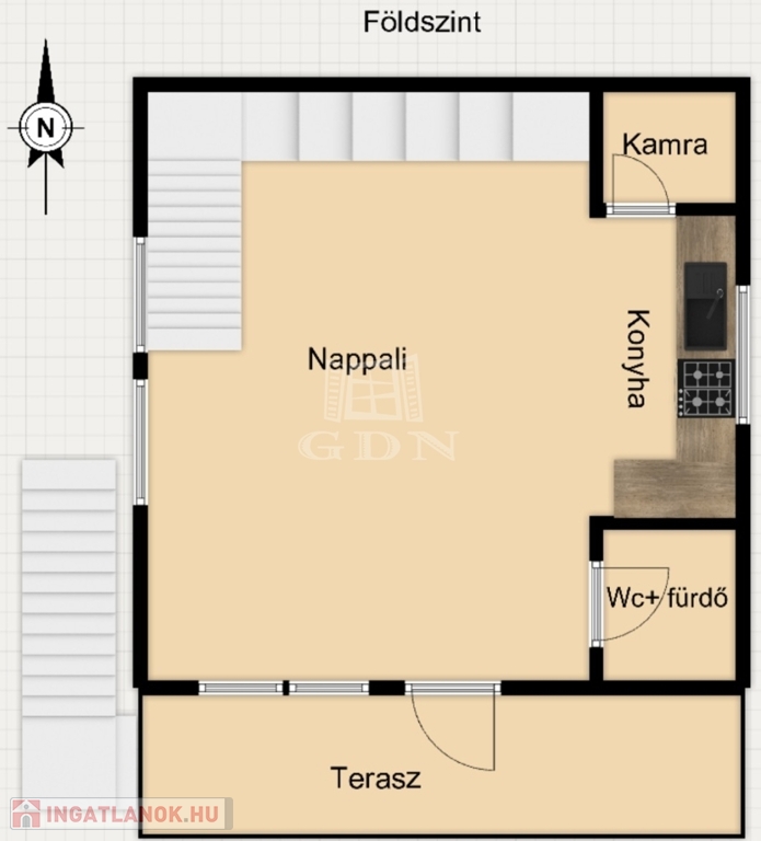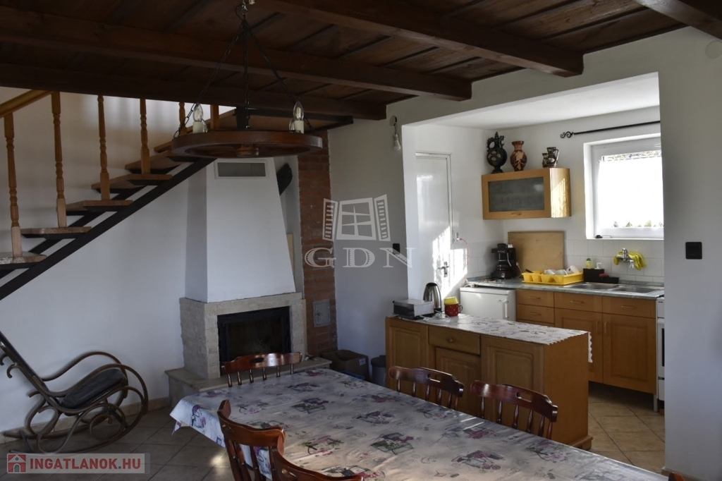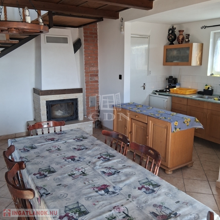 - A középső szinten egy tágas fogadótér vár minket étkezővel, konyhával, kamrával és egy fürdőszobával. A bejárattal szemben egy jól működő, néhány éves kandalló tereli magára a figyelmet.