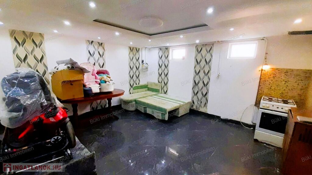 Az alsó szinten egy igényesen kialakított szuterén található, amely messze túlmutat a „pince” fogalmán. A világítás átgondolt, hangulatos, a két felső ablaknak köszönhetően pedig természetes fény is érkezik ide. Ide is be van vezetve a gázcső, konvektorral fűthető, főzési lehetőséget kínál, sőt, akár külön élettérként is használható némi újragondolást követően. Ez a szint önmagában is rengeteg lehetőséget rejt - legyen szó munkáról, hobbiról vagy akár vendégtérről.