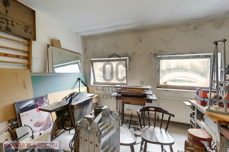 Ház: 2 bejárat így külön is válaszhatóan , 2 szintes , tégla , klasszikus 2 generációs ház , 3 nappalival + 5 hálószobával , 2 fürdővel , nagy műhellyel és garázzsal , tetőterasszal befejezésre váróan .