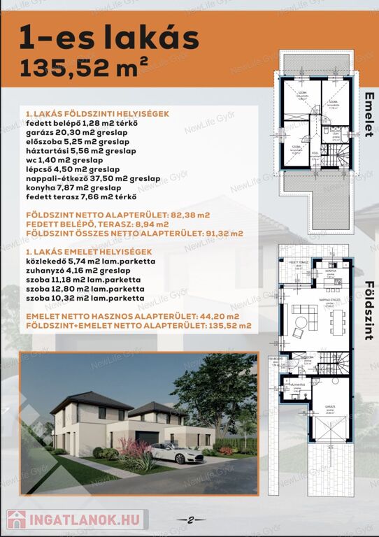 A földszint és az emelet nettó alapterülete így 135,52 nm.