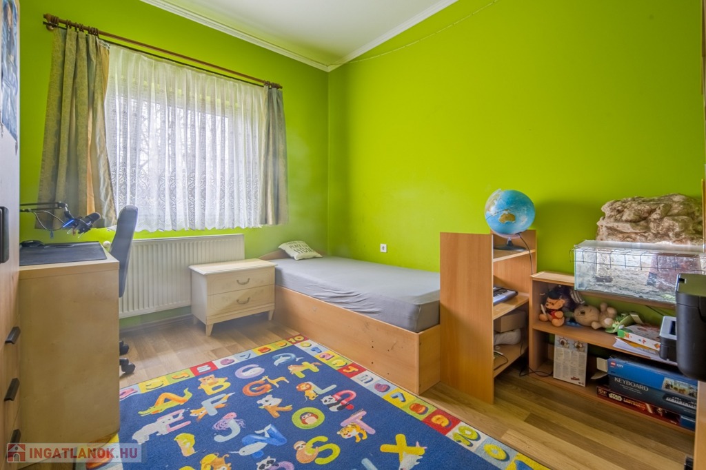 A 736 m²-es telken elhelyezkedő ingatlanban 3 hálószoba, amerikai konyhás nappali, fürdőszoba, vendégmosdó és egy spejz kapott helyet.