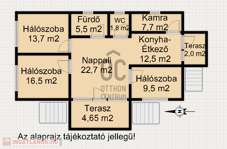 - optimális elrendezés: 3 tágas hálószobával, nappaliból nyíló konyha-étkezővel, kamrával, külön fürdő és WC-vel, terasszal