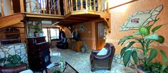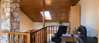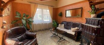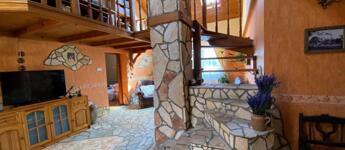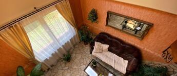 A tágas nappalit (kb.40 nm) spanyol csempe és természetes homokkő burkolja, a mennyezetet fa burkolatok díszítik, melyek melegséget és karaktert adnak a térnek. Ideális helyszín meghitt családi ebédekhez és baráti összejövetelekhez, ahol jókat lehet enni, nevetni, együtt lenni. Itt a belmagasság 4,40 cm, így állógaléria növeli az életteret, ahol kellemes könyvtárszoba, dolgozórész, iroda lett kialakítva, a home-office-ban dolgozók örömére.