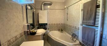 Fürdője sarokkádas, WC-vel, bidével, szellőztethető.