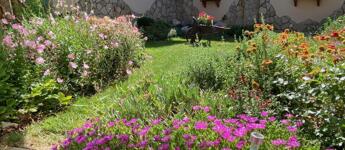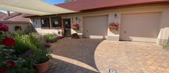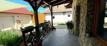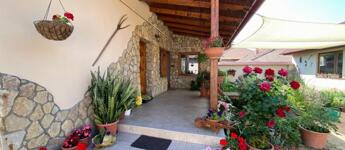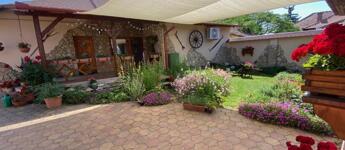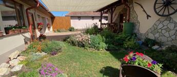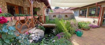 A bejárat előtt fedett terasz hív pihenésre, az udvar nagy részét térkő borítja, és egy mesésen kialakított, csodás virágos gondozott kert, kis tó halakkal, tavirózsákkal és hangulatos híd, igazi kis édenkert. Én teljesen beleszerettem, ezt látni kell!