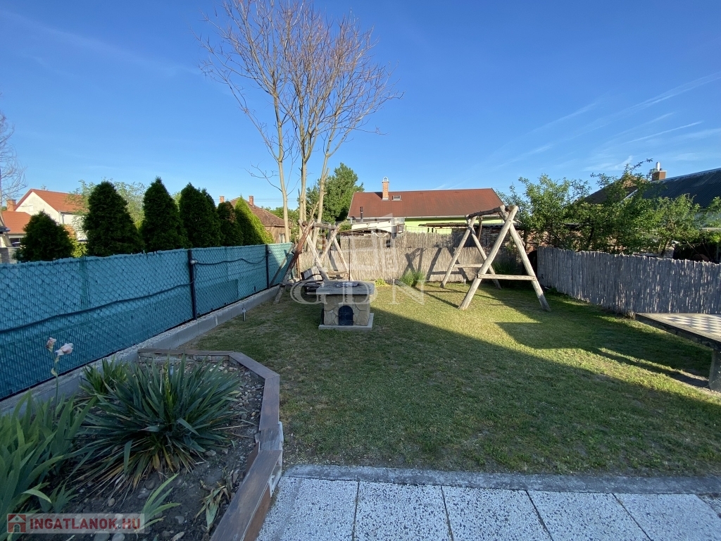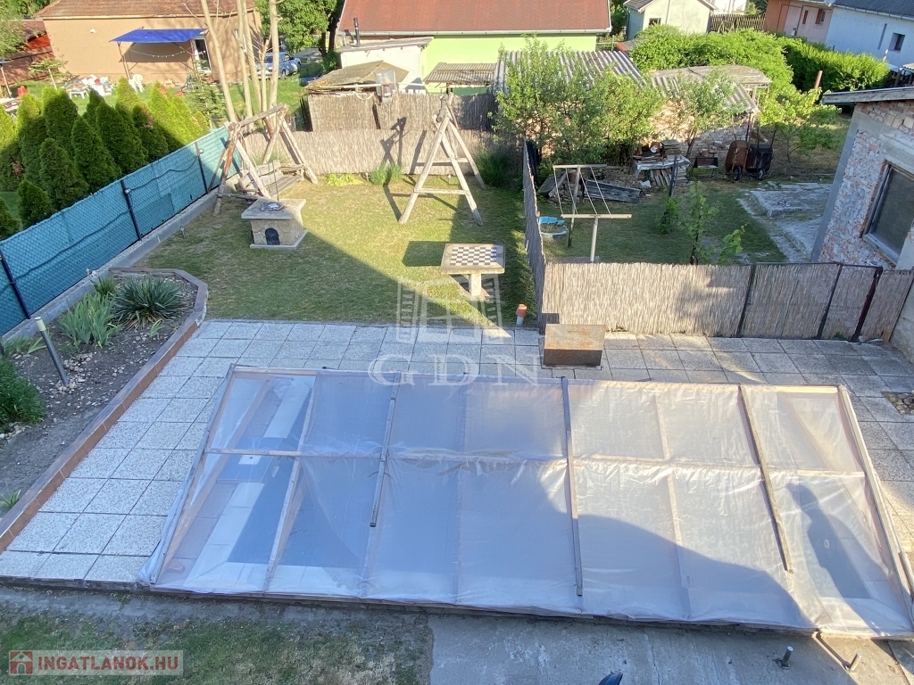 A 720 m2-es füvesített, gondozott, fúrt kúttal ellátott kertben helyet kapott egy gépesített 3x6 méteres medence, valamint egy 2 autó számára helyet adó automata kapuval rendelkezős garázs is.
