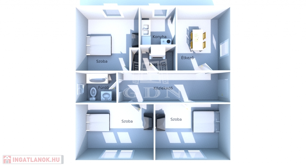 amerikai konyha, étkező+nappali, 3 szoba, fürdőszoba, külön helyiségben wc, erkély.
