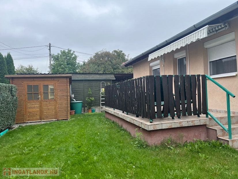 Előkertben fedett autóbeálló,hátsó és oldalsó kertben tárolók.