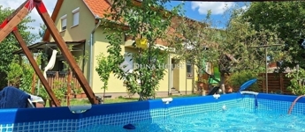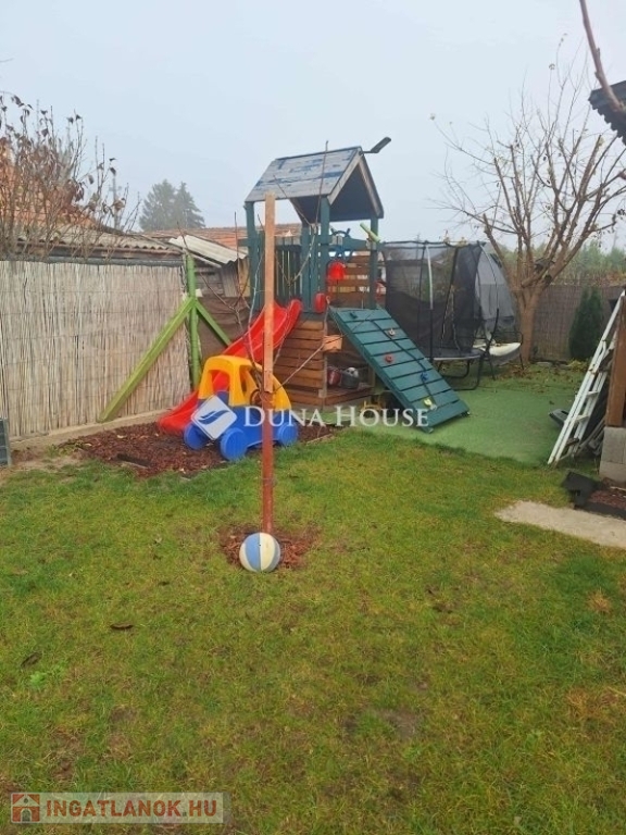 Rendezett kert gyümölcsfákkal, virágokkal, mászóka csúszdával, így gyermekes családok számára is ideális, fúrt kútról öntözhető kert gazdaságos fenntartás