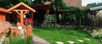 A gondozott parkosított udvaron fedett gépkocsibeálló, 18 m2-es 1.5 m mély fedett medence, kerti hinta, grillező és kerti faház található.
