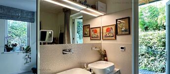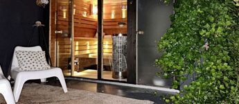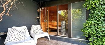 Main floor: A few steps lead up to the mezzanine floor, where there are two bedrooms, currently en-suite. The bathroom has a double walk-in shower, free-standing bath, two sinks. The back terrace can be accessed from both the bedroom and the bathroom. The garden sauna and plunge pool complete the wellness atmosphere.