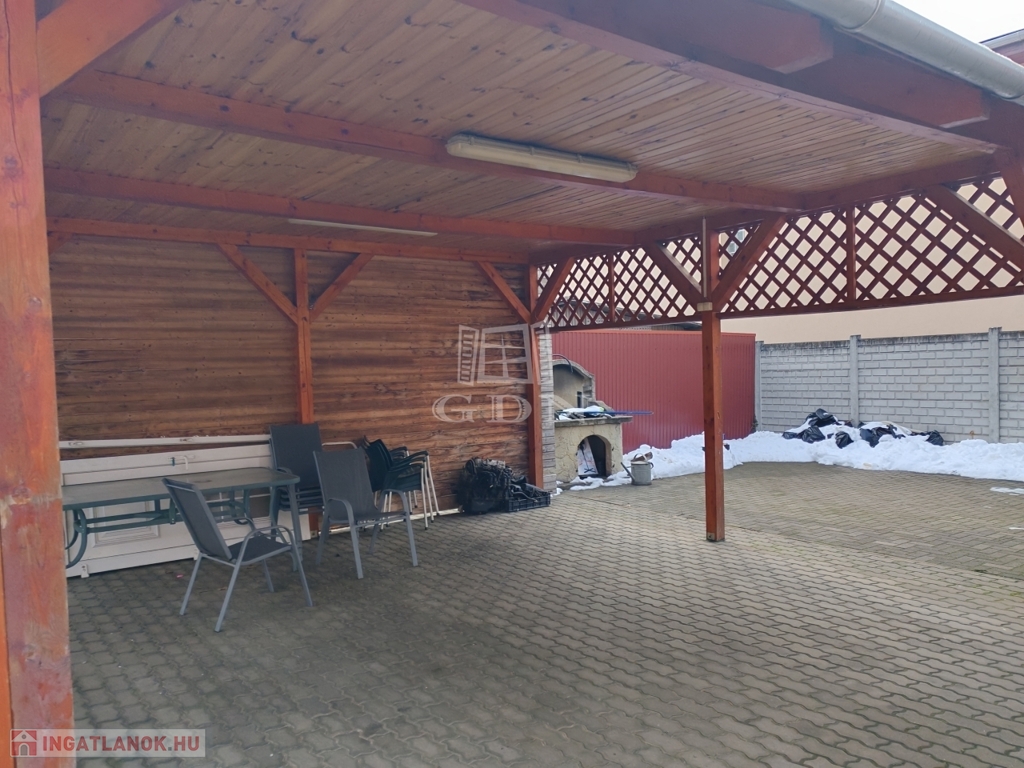 Garázs:25nm, szerelőaknás, pince lejárattal + 3 db tároló helyiség, kerti fedett kiülő ,fából, tetővel ellátva.