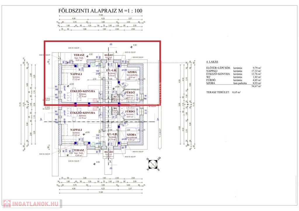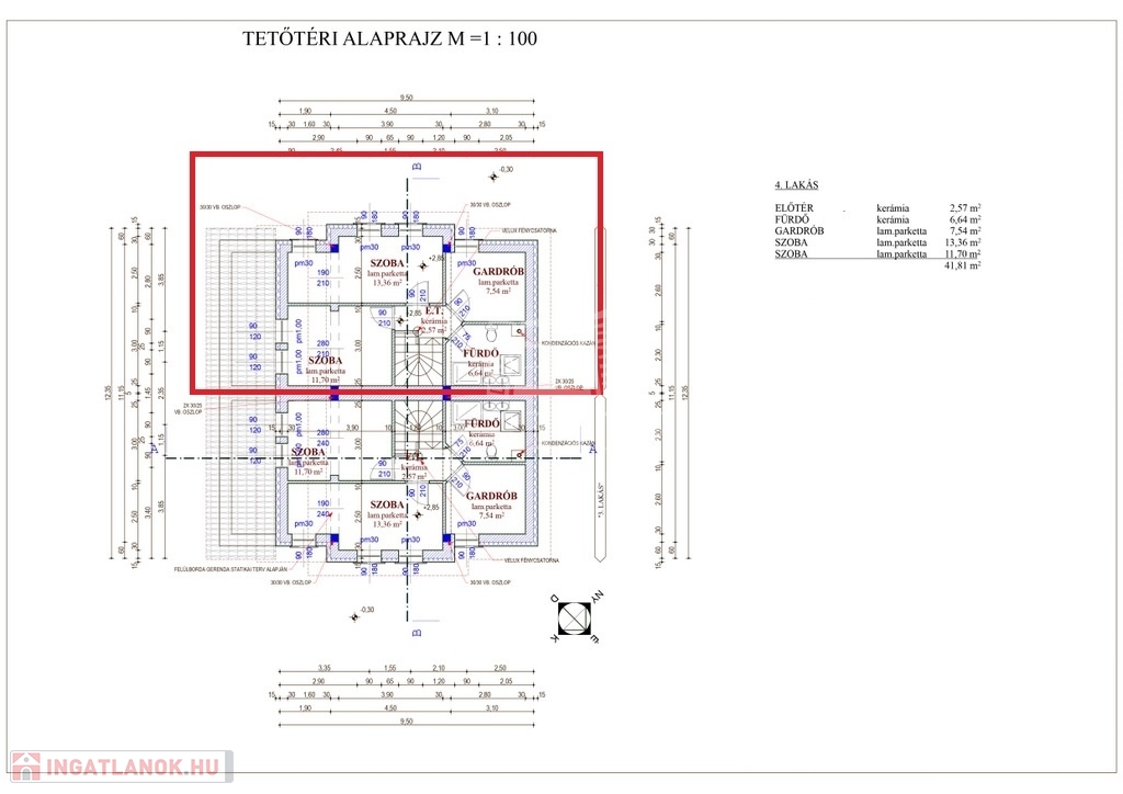 A lakás 96 nm lakóterülettel rendelkezik, a földszint nappali, étkező, konyha, hálószoba, fürdőszoba, külön wc, közlekedő, az emelet két szoba, egy félszoba, fürdőszoba wc-vel, közlekedő elrendezésű.