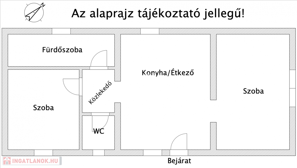 - Az egy szintes ingatlanba található: előszoba/konyha/étkező, 2 szoba, fürdőszoba, WC