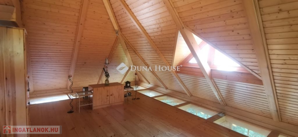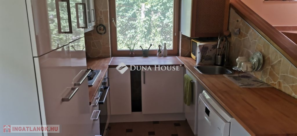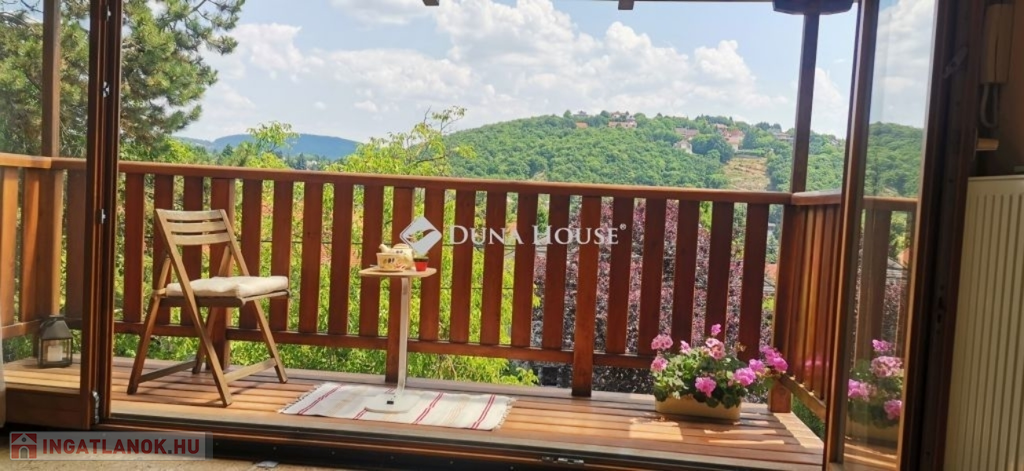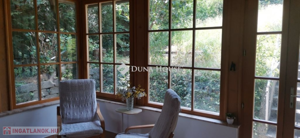 A ház 2005-ben épült, egyedi kialakítású, tetőtér beépítéses, kétszintes tégla családi ház. Az ingatlan egyik nagy előnye, hogy akár két generáció együttélésére is alkalmas. Együtt de mégis külön! A házat egy hatalmas kert, borospince, nagyméretű garázs, valamint további autóbeállási lehetőség teszi még kényelmesebbé a nagycsaládosok számára.Fűtése, meleg víz ellátása gáz cirkóval megoldott, a földszinten padlófűtéssel kiegészítve.A két generációs házban az egyik lakrész 35 m2 nagyságú, a földszinten a bejárattól jobbra található, amely áll egy előtérből nyiló szobából, konyhából és fürdőszobából, wc-vel. A konyhából egy átadó ablak nyílik a nappaliban lévő étkezőasztal felé, amely a családi összejöveteken praktikus megoldás a vendégek kiszolgálására. A nappali különös hangulatát a három oldalán elhelyezkedő kazettás fa ablakok adják, melyek révén mintha közvetlenül a fák tövében ülnénk, miközben szemlélhetjük a természet zöldjét az énekesmadarak, a mókusok játékát. Igazán különleges érzés, bent vagyunk, de mégis kint érezzük magunkat!A másik lakrészhez tartozó konyha a tágas nappali túloldaláról nyílik, amely a hátsó kertre nyílik és az oldalkertre néz, modern és kényelmes U-alakú elrendezésével. Itt található még egy háztartási helység és egy wc mosdóval. Innen jutunk fel a kétkarú lépcsőn az emeletre, amely egy egy légterű, fenyőfával burkolt tetőtéri nappali dolgozósarokkal. Ez egy légkondcionálóval ellátott, napfényes, hatalmas belső tér, amely sok lehetőséget rejt magában, plusz érdekes megoldás, hogy körben üvegpadló van, amely a fölszinti nappalit is plusz természetes fénnyel látja el. Nagyon hangulatos, a fényképek nem adják vissza, hogy mennyivel növeli a térérzetet ez a különleges padló kialakítás.A felső szinten ezen kívül egy kisebb szoba, gyerekszoba található, melllette zuhanyzós fürdőszoba wc-vel és a hálószoba a teljes faltól-falig tartó diófa terasszal! Erről a fedett teraszról is lenyűgöző, örökpanorámás kilátás nyílik a budai hegyekre, amelyet a teljes szélességében eltolható nyílászárókkal élvezhetünk maximálisan. A kert hatalmas, kissé emelkedik felfelé a kert vége felé, felúton a domboldali borospince, amely egy földdel borított boltíves hobbit pince.A ház szigetelt, szépen bevakolt, nagyon jó állapotban van, a tulajdonosok építették a család részére, kezdetnek nyaralóként, aztán állandó lakhelyként szolgált. Jelenleg nem lakják az ingatlant, gyorsan birtokba vehető. A környék csendes, pár utcával odébb található buszjárat 10 perc alatt Hűvösvölgyben van, onnan a város fél óra alatt elérhető. A közelben óvoda, iskolák, kisebb boltok, éttermek, szolgáltatók megtalálhatóak és persze rengeteg kirándulási lehetőség.Nézzük meg együtt, ne maradjon le erről a hangulatos, egyedülálló ingatlanról! Töltse már itt a nyarat!